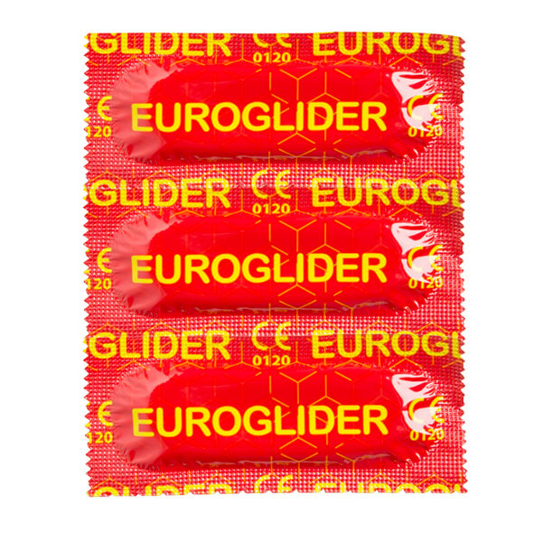 Euroglider condoms are made of natural rubber latex. Condoms have the same nominal width but slightly more lubricant than Ambassador Glyder.