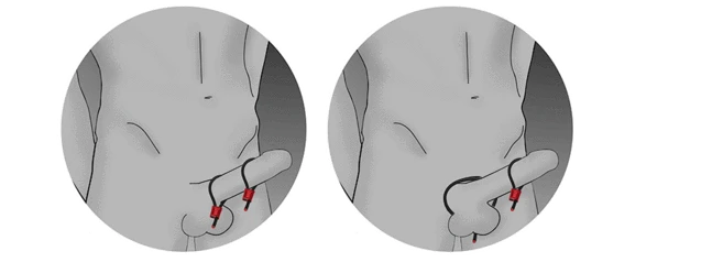 ElectraStim Prestige ElectraLoops can be worn in a variety of different ways. Two of the most popular configurations are shown below; both loops worn on the shaft or one on the shaft and one around the scrotum.